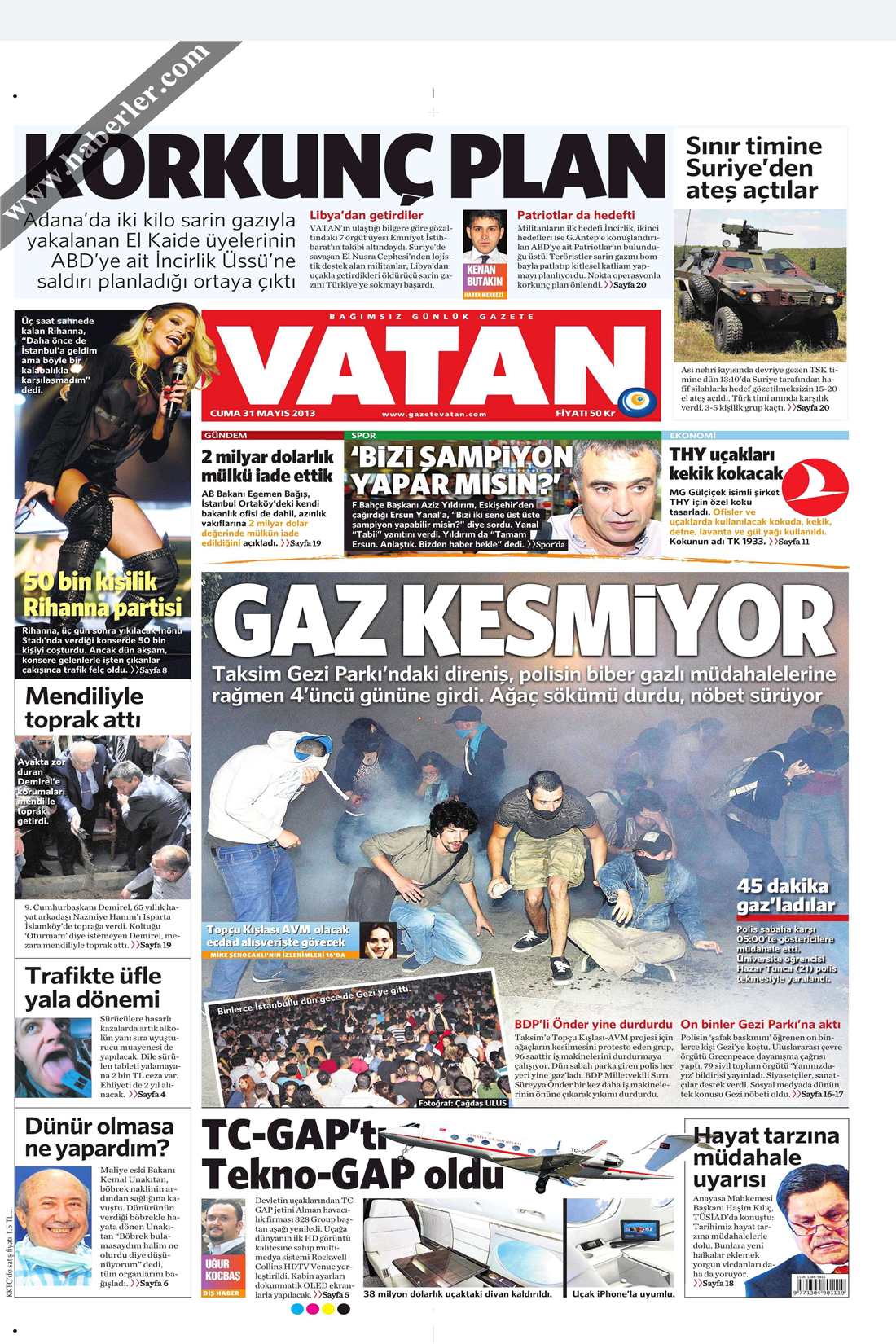 «Τα αέρια δεν τους σταματούν» είναι ο τίτλος της εφημερίδας Vatan. H τουρκική εφημερίδα αναφέρεται στις διαδηώσεις χιλιάδων Τούρκων στο πάρκο Γκεζί στην πλατεία Ταξίμ που διαμαρτύρονται για να μην κοπούν τα δέντρα και να μην χτιστεί στο σημείο αυτό εμπορικό κέντρο. « η αστυνομία επεμβαίνει κάθε μέρα με αέρια όμως οι διαδηλωτές δεν πτοούνται και επι 4 ημέρες συγκεντρώνονται στο σημείο αυτό».