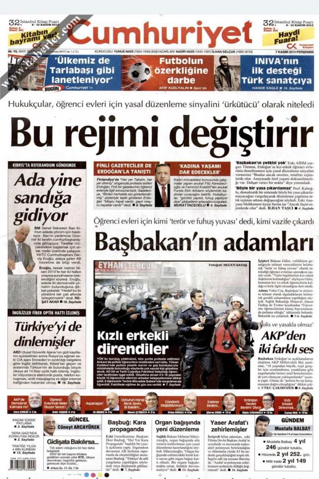 «Αυτό αλλάζει το καθεστώς» είναι ο τίτλος της Cumhuriyet. H τουρκική εφημερίδα αναφέρει πως « οι νομικοί πιστεύουν πως τα σχέδια και οι δηλώσεις Ερντογάν σχετικά με τη συγκατοίκηση νέων μπορούν να φέρουν στην Τουρκία ακόμη και την αλλαγή του καθεστώτος». Ο πρώην δικαστής του Ευρωπαϊκού Δικασητηρίου Ανθρωπίνων Δικαιωμάτων μιλά στην εφημερίδα και τονίζει πως « αυτά που λέει ο Ερντογάν μπορούν να συμβούν μόνο σε δικτατορικά καθεστώτα.Στο Σύντγμα αναγράφεται η προστασία της προσωπικής ζωής».