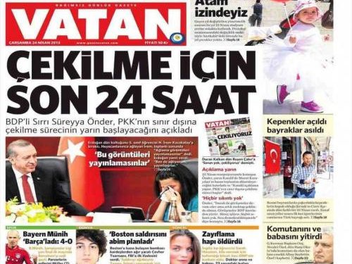 «24 ώρες για την αποχώρηση» είναι ο τίτλος Vatan. H τουρκική εφημερίδα αναφέρει πως ο βουλευτής του φιλο-κουρδικού κόμματος Ειρήνης και Δημοκρατίας Σουρεγιά Οντέρ αποκάλυψε πως η απόσυρση των ανταρτών του PKK από την Τουρξία θα ξεκινήσει στις 25 Απριλίου.