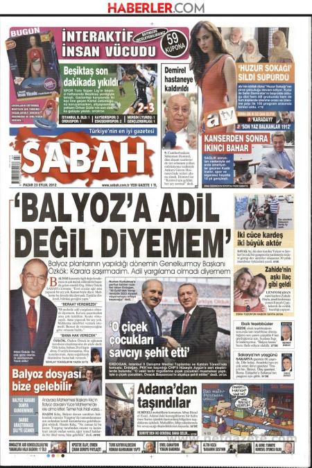 «Δεν μπορώ να πω πως η Βαριοπούλα ήταν άδικη» είναι ο τίτλος της Sabah. H τουρκική εφημερίδα αναφέρεται σε δηλώσεις του πρωην αρχηγού του γενικου Επιτελείου της Τουρκίας Χιλμί Οζκιόκ ο οποίος υποστηρίζει πως δεν πιστεύει πως η δίκη για τη Βαριοπούλα δεν ήταν δίκαιη.