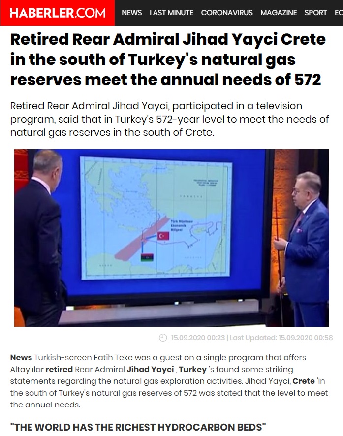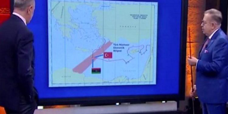 «H Λιβύη κάνοντας συμφωνία μαζί μας, παρά τη συμφωνία της Ελλάδας με την Αίγυπτο, κέρδισε 39.000 τετραγωνικά στρατιωτική έκταση. Αν εμφανιστεί μία κυβέρνηση στη Λιβύη και πει ότι «Κάναμε λάθος συμφωνία, αυτό πρέπει να το δώσουμε στην Ελλάδα», σημαίνει ότι χάνει μία έκταση ίση με τέσσερις φορές την έκταση της Κύπρου. Λέγεται πως σε αυτή την περιοχή υπάρχουν τα πιο πλούσια κοιτάσματα υδρογονανθράκων στον κόσμο. Στα νότια της Κρήτης. Για αυτό το λόγο με τους υπολογισμούς που γίνονται αυτή τη στιγμή, τα κοιτάσματα είναι σε επίπεδο να καλύψουν για 572 χρόνια τις ανάγκες της Τουρκίας».