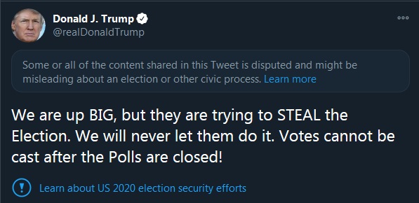 Ωστόσο τo Twitter προειδοποίησε σήμερα τους χρήστες του για το μήνυμα του απερχόμενου προέδρου Ντόναλντ Τραμπ στο οποίο αυτός κατηγορεί τους Δημοκρατικούς ότι προσπαθούν «να κλέψουν» τις εκλογές.