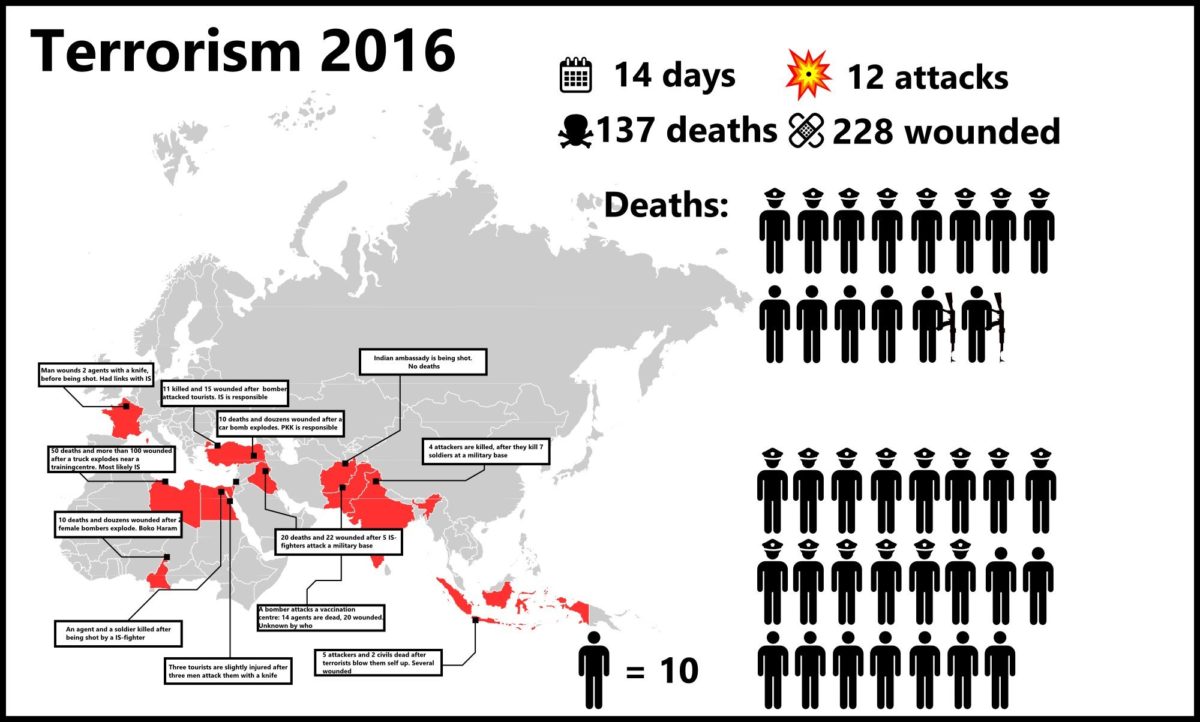 Το 2016 μετρά μόλις 17 ημέρες ζωής. Κι όμως αποδεικνύεται μια χρονιά πολύ αιματηρή. Μια χρονιά που η τρομοκρατία έκανς ποδαρικό σε πάρα πολλά σημεία του πλανήτη.