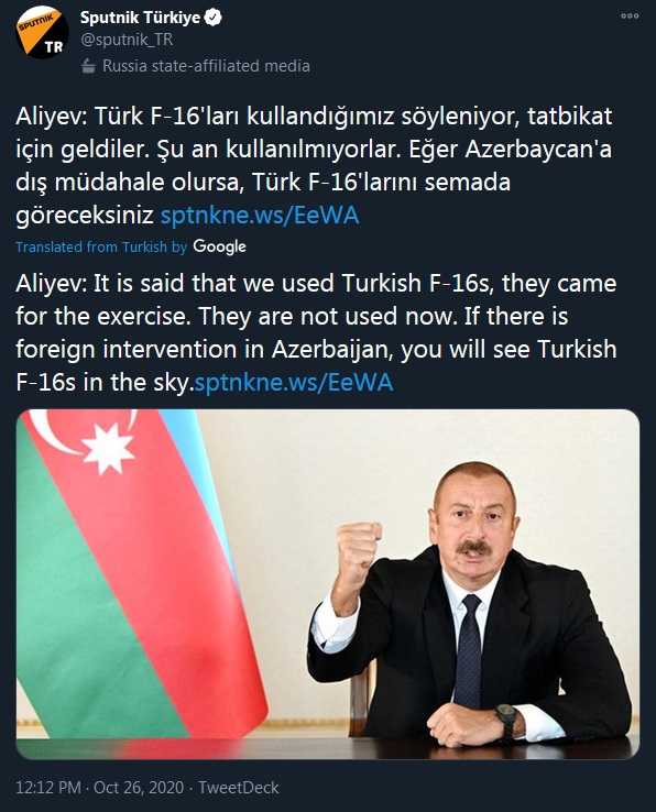 «Λέγεται ότι χρησιμοποιήσαμε τουρκικά F-16. Ήρθαν για ασκήσεις. Αλλά αν υπάρξει εξωτερική παρέμβαση στο Αζερμπαϊτζάν, τότε θα δείτε τουρκικά F-16 στον ουρανό», είπε ο Αλίγιεφ.