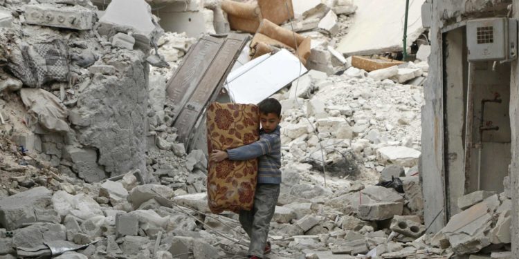 Φωτογραφία: Reuters (Παιδί κουβαλάει ένα στρώμα που βρήκε σε χαλάσματα στο Χαλέπι της Συρίας)