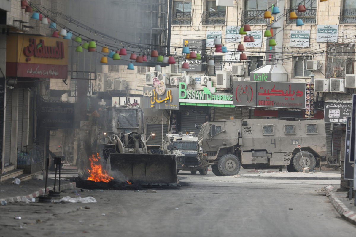 Τεθωρακισμένο του ισραηλινού στρατού έκανε περιπολίες στην πόλη, πίσω από εκσκαφέα του Μηχανικού, σε κεντρικό δρόμο της Τζενίν.