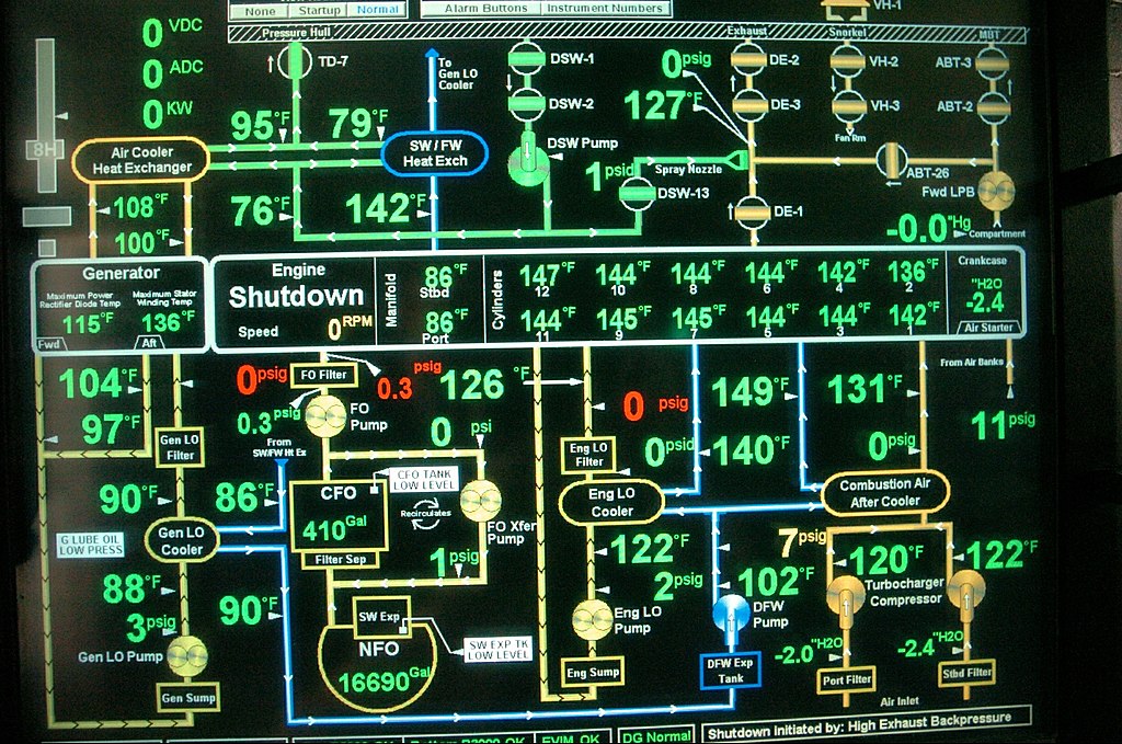 Πάνελ που δείχνει την λειτουργία κινητήρων σε υποβρύχιο κλάσσης Virginia