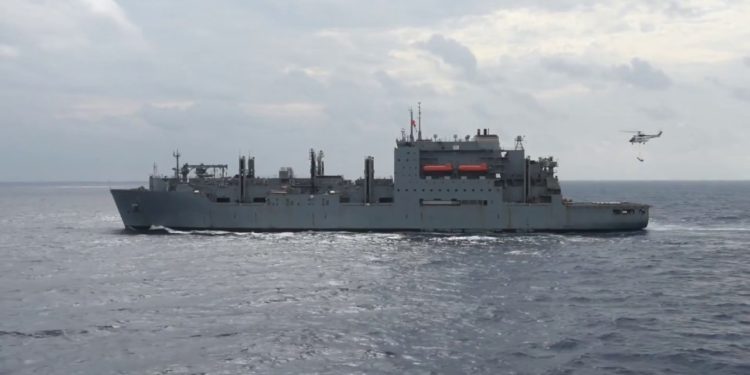 Το αεροπλανοφόρο USS Carl Vinson (CVN 70) λαμβάνει πυρομαχικά εν πλω κατά τη διάρκεια αναπλήρωσης απο τους «Black Knights» (της Μοίρας Ελικοπτέρων HSC) και με το Στρατιωτικό Σώμα του πλοίου ανεφοδιασμού USNS Richard E. Byrd (T-AKE 4) στη Θάλασσα των Φιλιππινων. Το Πολεμικό Ναυτικό των Η.Π.Α. περιπολεί την περιοχή Ασίας – Ειρηνικού για περισσότερα από 70 χρόνια προωθώντας την περιφερειακή ειρήνη και ασφάλεια.