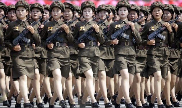 Σαν ρομπότ, τα πόδια τους τέλεια συγχρονισμένα οι γυναίκες στρατιώτες του Κιμ δημιουργουν την τέλεια παρέλαση για την επέτειο των 60 χρόνων απο το τέλος του Κορεατικου πολέμου.