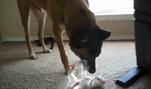 Άλλωστε αυτη η λευκή, χνουδωτή μπάλα ειναι κάτι το άγνωστο γι’αυτον. Στη συνέχεια μυρίζει το γατακι, το σκουνταέι, και το γλύφει, εξερευνώντας την αγνωστη γι’αυτον περιοχή και τελικά αφου τελειώνει την «ανάκριση» μάλλον ο Σεφ αποφασίζει οτι το γατάκι δεν ειναι θέμα «ενθικής ασφάλειας» και όπως θα δείτε στο βίντεο οι δυο τους γίνονται φίλοι!