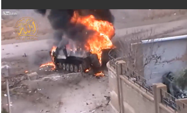 Το βίντεο δείχνει τον θάνατο ενός πληρώματος τεθωρακισμένου των κυβερνητικών δυνάμεων που φλέγεται. Οι εκρήξεις είναι απανωτές και ισχυρές και μια ομάδα ανταρτών “πανηγυρίζει” επικαλούμενοι τον Αλλάχ τον οποίο ευχαριστούν για την επιτυχή βολή!