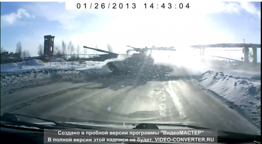 Μέσα από τους όγκους χιονιού στις άκρες του δρόμου το τανκ διέσχισε κάθετα το δρόμο και εξαφανίστηκε μέσα στο χιονισμένο τοπίο. Το περιστατικό αυτό καταγράφηκε από βιντεοκάμερα τοποθετημένη σε διερχόμενο αυτοκίνητο, που έτυχε να κινείται εκείνη τη στιγμή στην εθνική οδό. Κοντά σε αυτό το τμήμα του δρόμου βρίσκεται ένα εργοστάσιο τεθωρακισμένων, από όπου τα στρατιωτικά οχήματα μεταβαίνουν στο πεδίο δοκιμών.