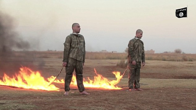 Οι στρατιώτες του Ισλαμικού Κράτους,όπως φαίνεται και στο βίντεο ΕΔΩ αφήνουν τους Τούρκους να φτάσουν μπουσουλώντας σιδεροδέσμιοι ως τον τόπο του μαρτυρίου τους. Εκεί στέκονται όρθιοι, ενώ οι τζιχαντιστές προσαρμόζουν στις αλυσίδες τους πανί εμποτισμένο με εύφλεκτο υλικό και του βάζουν φωτιά.