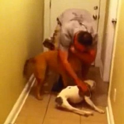 Όπως δείχνει το εξαιρετικά συγκινητικό βίντεο, οταν τα άλλα δυο σκυλιά τρεχουν για να καλωσορίσουν το αφεντικό τους, η Εμμα, το ημίαιμο pit-bull, μένει στην τρίτη θέση αλλά προσπαθεί με ολη την δύναμη των μπροστινών της ποδιών και με τον δικό της τρόπο να υποδεχτεί και αυτη τον στρατιωτικό ιδιοκτήτη της.