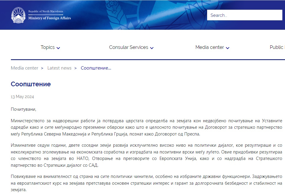 «Το Υπουργείο Εξωτερικών επιβεβαιώνει τη σταθερή αποφασιστικότητα της χώρας για την άνευ όρων τήρηση των Συνταγματικών διατάξεων καθώς και όλων των διεθνώς αναλαμβανόμενων υποχρεώσεων, όπως η πλήρης τήρηση της Συμφωνίας Στρατηγικής Εταιρικής Σχέσης μεταξύ της Δημοκρατίας της Βόρειας Μακεδονίας και της Δημοκρατίας της Ελλάδας, γνωστή ως Συμφωνία των Πρεσπών.