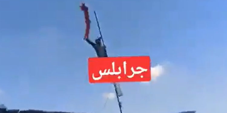 Σε βίντεο που έκανε σήμερα την εμφάνισή του στα μέσα κοινωνικής δικτύωσης καταγράφονται απλοί πολίτες στη Συρία που κατεβάζουν την Τουρκική σημαία από φυλάκιο στην πόλη Jarabulus, βορειοανατολικά του Χαλεπίου.
