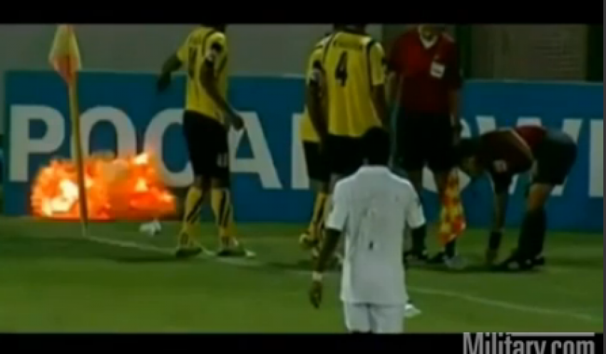 Στο Ιράν έγινε! Στη πόλη Ισφαχάν, ο αγώνας έχει διακοπεί λόγω ρίψης αντικειμένων στον αγωνιστικό χώρο. Όπως βλέπετε στο βίντεο ,ένας παίκτης σκύβει ,πιάνει ένα από τα αντικείμενα, χωρίς να δει τι είναι και το πετά εκτός αγωνιστικού χώρου. Μόνο που αυτό που πέταξε ήταν χειροβομβίδα που έσκασε χωρίς ευτυχώς να τραυματίσει κάποιον!
