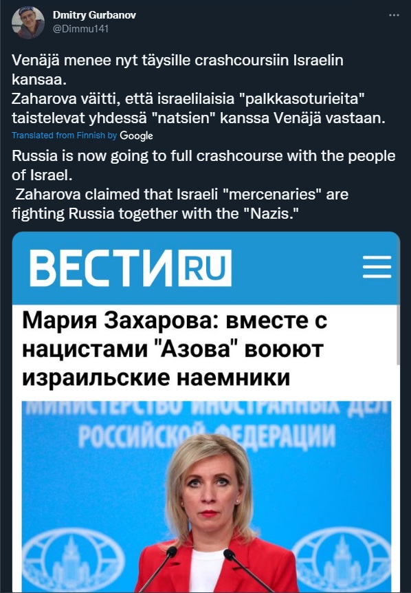 «Θέλω να πω κάτι που οι Ισραηλινοί πολιτικοί δεν θέλουν χωρίς αμφιβολία να ακούσουν, αλλά ίσως αυτό θα τους ενδιαφέρει. Στην Ουκρανία, Ισραηλινοί μισθοφόροι είναι δίπλα στους μαχητές του Αζόφ», δήλωσε η εκπρόσωπος της ρωσικής διπλωματίας Μαρία Ζαχάροβα σε μια συνέντευξη στο ραδιόφωνο Sputnik.