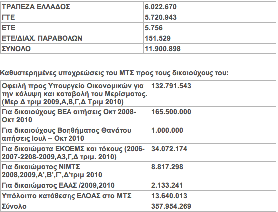Το ΜΤΣ χρωστάει: γεγονός 357.954.269! Σε ποιούς: Στα παιδιά μας 165.500.000, στις χήρες μας 1.000.000, στους συνδέσμους αποστράτων μας 2.133.241, στο εφάπαξ μας 13.640.013, στο μέρισμα του ΕΚΟΕΜΣ μας 34.072.174, στο νοσοκομείο μας 8.817.298 και μόνο ένα μικρό ποσοστό της τάξεως του 30% στο κράτος για την ταμειακή διευκόλυνση που του έκανε από το Δ τρίμηνο του 2009 και μετά.