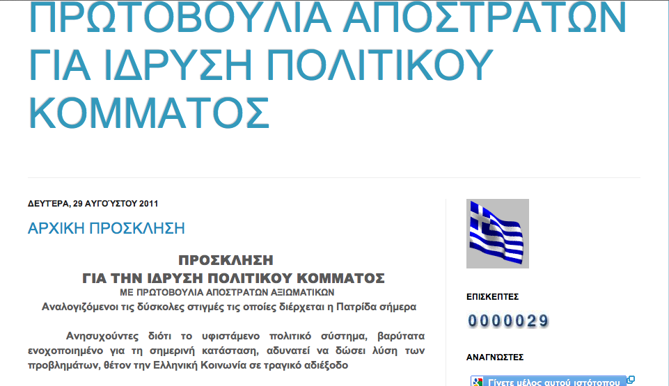 Στην ιστοσελίδα που έχουν δημιουργήσει τα ιδρυτικά μέλη του κόμματος αναφέρουν ότι “το νέο κόμμα ιδρύεται υπό τις παρούσες δύσκολες, για την Πατρίδα μας, συνθήκες οι οποίες χαρακτηρίζουν το τέλος της μεταπολιτευτικής περιόδου. Η νέα όμως αυτή πολιτική δύναμη που δημιουργείται και εμφανίζεται στον πολιτικό βίο της Χώρας μας, με την ενθουσιώδη υποστήριξη των φίλων μας από όλη την Ελλάδα, θα αποτελέσει την ελπίδα για την ανόρθωση του εθνικού φρονήματος και της αυτοπεποίθησης του Λαού”.