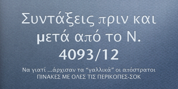 2. στα πληρωτεα ποσα μετα την εφαρμογη του ν.4093/12 εληφθησαν υπ’ οψιν η εισφορα αλληλεγγυης συνταξιουχων, η εισφορα των διαταξεων της παρ. 10 του αρθρου 1 του ν.4024/11, η εισφορα των διαταξεων του αρθρου 1 του ν.4051/12, η εισφορα της υποπαρ. β.3.α της παρ. β του αρθρου πρωτου του ν.4093/12 (10% στο υ/β ‘& 15% στουσ υπολοιπουΣ αξιωματικουσ). η υγειονομικη περιθαλψη (4,00%), ο φορος εισοδηματος (με αφορολογητο 5.000,00 €) 6 το εναντι της ειδικης εισφορας αλληλεγγυης επι των νεων μειωμενων μισθολογικων αποδοχων.