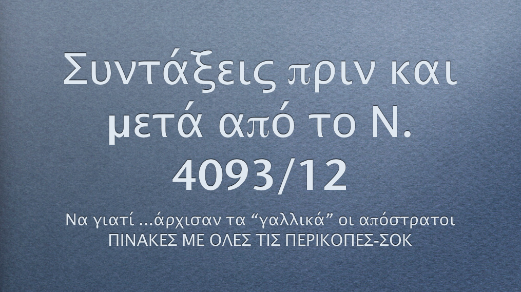 1. Στα πληρωτεα ποσα προ εφαρμογης του ν.4093/12 εληφθησαν υπ’ οψιν η εισφορα αλληλεγγυησ συνταξιουχων, η εισφορα των διαταξεων της παρ. 10 του αρθρου 1 του ν.4024/11, η εισφορα των διαταξεων του αρθρου 1 του ν.4051/12, η υγειονομικη περιθαλψη (3,25%), ο φορος εισοδηματος (με αφορολογητο 5.000,00 €) & το εναντι της ειδικης εισφορας αλληλεγγυης επι των παλαιων μισθολογικων αποδοχων.