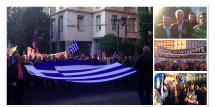 Στην πλατεία Κλαυθμώνος τον τόνο έδιναν τα πανό με τα συνθήματα: «ΟΧΙ ΣΤΗΝ ΑΠΑΞΙΩΣΗ ΚΑΙ ΤΗΝ ΕΞΑΘΛΙΩΣΗ – Η ΤΡΟΙΚΑ ΣΚΟΤΩΝΕΙ ΤΟΝ ΕΛΛΗΝΙΚΟ ΛΑΟ – ΑΞΙΟΠΡΕΠΕΙΑ, ΔΙΚΑΙΩΜΑΤΑ, ΑΛΛΗΛΕΓΓΥΗ- ΟΧΙ ΣΤΟ ΞΕΠΟΥΛΗΜΑ ΤΗΣ ΠΑΤΡΙΔΑΣ- ΟΛΟΙ ΜΑΖΙ ΜΠΟΡΟΥΜΕ- ΟΙ ΑΔΙΚΕΣ ΠΕΡΙΚΟΠΕΣ ΘΑ ΑΝΑΨΟΥΝΕ ΦΩΤΙΕΣ-ΕΛΛΗΝΕΣ ΠΡΟΔΩΜΕΝΟΙ ΟΧΙ ΤΑΠΕΙΝΩΜΕΝΟΙ ΑΝΤΙΣΤΑΘΕΙΤΕ ΕΝΩΜΕΝΟΙ- κ.ά. Συνάδελφοι απόστρατοι απ’ όλη την Ελλάδα κι από τους τρείς κλάδους των ενόπλων δυνάμεων προερχόμενοι, ξαναβρισκόταν μετά από χρόνια και τα λέγανε. Συγκίνηση, αγκαλιές, κοινή διαπίστωση για τα χάλια που μας έφεραν, αλλά και αγωνιστικό πνεύμα. Δεν θα τους περάσει!
