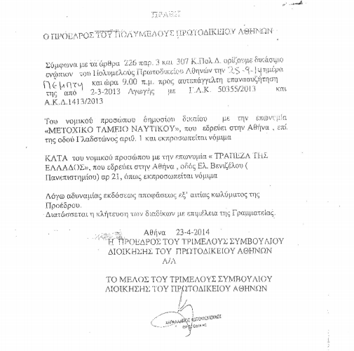 Το Πολυμελές Πρωτοδικίο Αθηνών, καλεί το ΜΤΝ σε νέα εκδίκαση της αγωγής κατά της Τράπεζας της Ελλάδος, για το «κούρεμα» των καταθέσεων του ΜΤΝ.