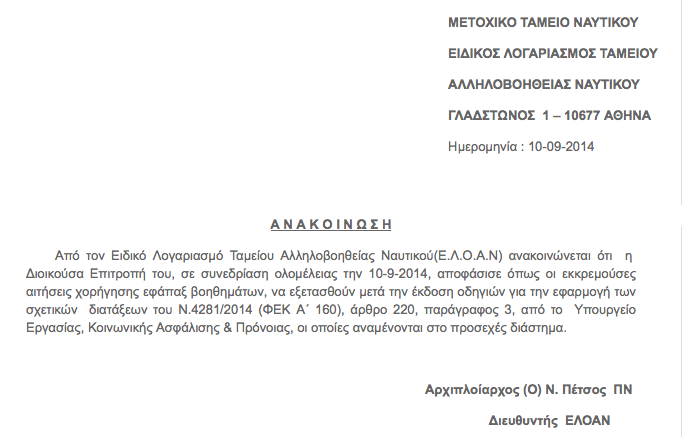 “Από τον Ειδικό Λογαριασμό Ταμείου Αλληλοβοηθείας Ναυτικού(Ε.Λ.Ο.Α.Ν) ανακοινώνεται ότι  η  Διοικούσα Επιτροπή του, σε συνεδρίαση ολομέλειας την 10-9-2014, αποφάσισε όπως οι εκκρεμούσες αιτήσεις χορήγησης εφάπαξ βοηθημάτων, να εξετασθούν μετά την έκδοση οδηγιών για την εφαρμογή των σχετικών  διατάξεων του Ν.4281/2014 (ΦΕΚ Α΄ 160), άρθρο 220, παράγραφος 3, από το  Υπουργείο Εργασίας, Κοινωνικής Ασφάλισης & Πρόνοιας, οι οποίες αναμένονται στο προσεχές διάστημα”.