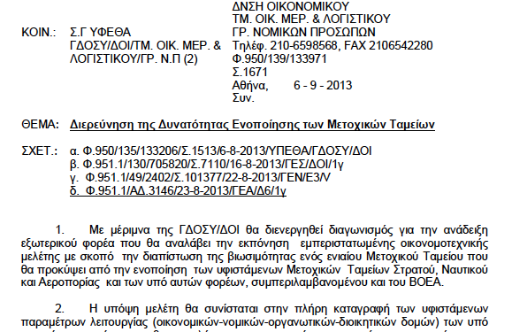 Με μέριμνα της ΓΔΟΣΥ/ΔΟΙ θα διενεργηθεί διαγωνισμός για την ανάδειξη εξωτερικού φορέα που θα αναλάβει την εκπόνηση εμπεριστατωμένης οικονομοτεχνικής μελέτης με σκοπό την διαπίστωση της βιωσιμότητας ενός ενιαίου Μετοχικού Ταμείου που θα προκύψει από την ενοποίηση των υφιστάμενων Μετοχικών Ταμείων Στρατού, Ναυτικού και Αεροπορίας και των υπό αυτών φορέων, συμπεριλαμβανομένου και του ΒΟΕΑ.