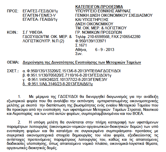 Με μέριμνα της ΓΔΟΣΥ/ΔΟΙ θα διενεργηθεί διαγωνισμός για την ανάδειξη εξωτερικού φορέα που θα αναλάβει την εκπόνηση εμπεριστατωμένης οικονομοτεχνικής μελέτης με σκοπό την διαπίστωση της βιωσιμότητας ενός ενιαίου Μετοχικού Ταμείου που θα προκύψει από την ενοποίηση των υφιστάμενων Μετοχικών Ταμείων Στρατού, Ναυτικού και Αεροπορίας και των υπό αυτών φορέων, συμπεριλαμβανομένου και του ΒΟΕΑ.