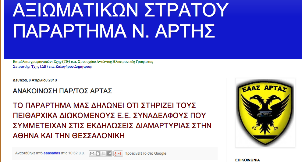 “Ρήγμα” παρουσιάστηκε στο “μέτωπο των θεσμικών Ενώσεων Αποστράτων”. Μπορεί τα “κεντρικά” των Ενώσεων στην Αθήνα να αρνούνται να πάρουν θέση για τις διώξεις που αναμένονται σε εν ενεργεία στρατιωτικούς για την επιλογή τους να παρουσιαστούν με στολή στις συγκεντρώσεις διαμαρτυρίας, υπάρχουν όμως και κάποια παραρτήματά τους που αντιστέκονται. Παράδειγμα η ΕΑΑΣ Λάρισας που μ΄ ένα απλό αλλά ξεκάθαρο μηνυμά της εκφράζει την συμπαράστασή της στους εν ενεργεία στρατιωτικούς.
