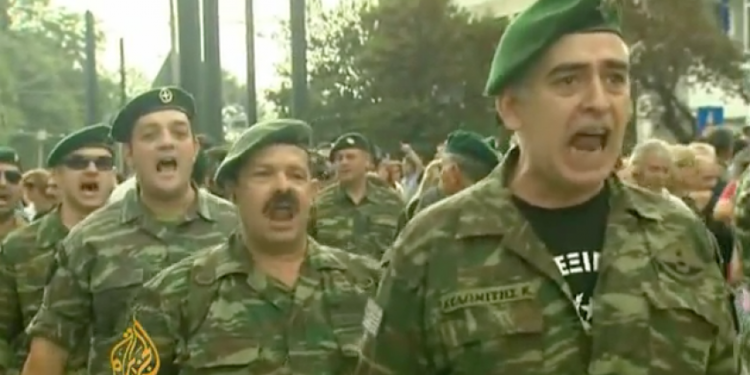 Στις 9 Οκτωβρίου, στα πλαίσια της διαδήλωσης που έλαβε χώρα στην Πλατεία Συντάγματος, ομάδα ένστολων προέβηκε σε ιδιότυπη παρέλαση στην οδό Αμαλίας, φωνάζοντας συνθήματα εθνικιστικού χαρακτήρα. Μέχρι τώρα δεν είναι ξεκάθαρο αν οι συμμετέχοντες αποτελούν εν ενεργεία προσωπικό του Στρατού Ξηράς ή είναι απόστρατοι, ενώ ενδέχεται μεταξύ αυτών να βρίσκονται και απλοί πολίτες.