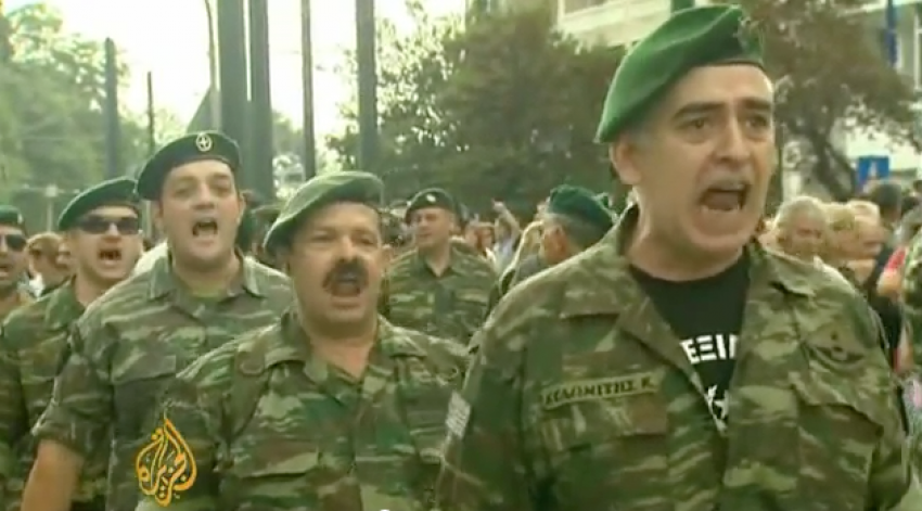 Στις 9 Οκτωβρίου, στα πλαίσια της διαδήλωσης που έλαβε χώρα στην Πλατεία Συντάγματος, ομάδα ένστολων προέβηκε σε ιδιότυπη παρέλαση στην οδό Αμαλίας, φωνάζοντας συνθήματα εθνικιστικού χαρακτήρα. Μέχρι τώρα δεν είναι ξεκάθαρο αν οι συμμετέχοντες αποτελούν εν ενεργεία προσωπικό του Στρατού Ξηράς ή είναι απόστρατοι, ενώ ενδέχεται μεταξύ αυτών να βρίσκονται και απλοί πολίτες.
