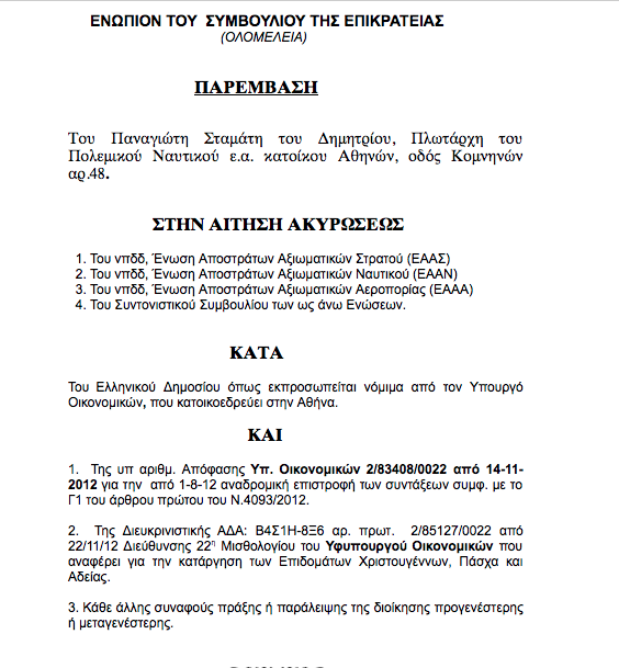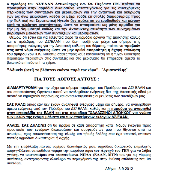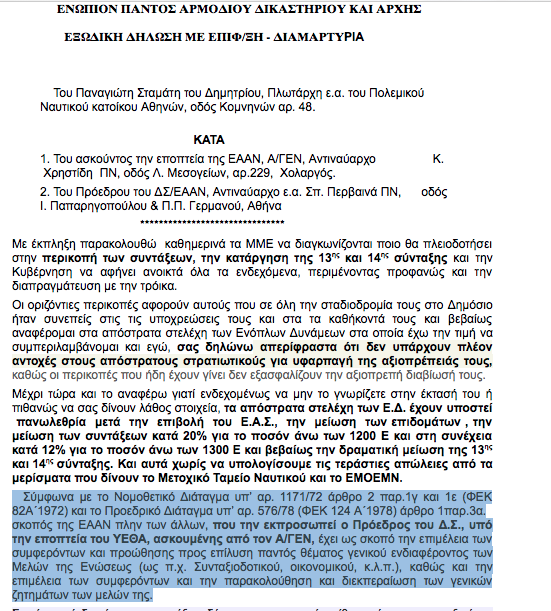 Ένας απόστρατος πλωτάρχης ο Πάνος Σταμάτης είχε κινητοποιήσει τις θεσμικές ενώσεις αποστράτων για να προσφύγουν στο Συμβούλιο της Επικρατείας. Ο κ.Σταμάτης έφθασε στο σημείο να στείλει εξώδικο στην Ένωση Αποστράτων Αξιωματικών Ναυτικού για να τους πείσει ότι έπρεπε να καταθέσουν προσφυγή.
