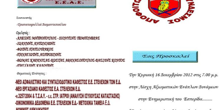 Τα θέματα που θα συζητηθούν θα είναι το νέο ασφαλιστικό και συνταξιοδοτικό καθεστώς των εν ενεργεία στελεχών , το νέο εργασιακό καθεστώς για τους απόστρατους και πάρα πολλά άλλα ενδιαφέροντα.