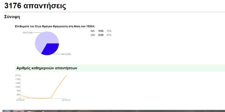 Δεν πήγε όπως περίμεναν οι εμπνευστές της το ηλεκτρονικό δημοψήφισμα για τον Φραγκούλη Φράγκο. Το ερώτημα ήταν αν πρέπει να γίνει ΥΕΘΑ ο πρώην Α/ΓΕΣ ή όχι. Όσο έμεινε στον “αέρα” η δημοσκόπηση είχε απρόσμενο αποτέλεσμα. Το 67% όσων συμετείχαν απάντησαν ΟΧΙ. Και σύμφωνα με τα στοιχεία δεν ψήφισαν και λίγοι.