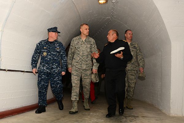 σε αποθήκη πυρομαχικών στις εγκαταστάσεις στο λιμάνι της Σούδας, μαζί με τον Ελληνα διοικητή η Ελλάδα, Στέλιο Παπαδάκη, (δεύτερος από δεξιά), και στην υποδοχή τους στο πλαίσιο εκδήλωσης τoυ προγράμματος CAPSTONE. Στην τρίτη φωτό, στο αμφιθέατρο ενημέρωσης, στο σλάιτς που προβάλλεται φαίνεται θέση της βάσης της Σούδας σε σχέση με τις τρεις εισόδους της Μεσογείου.