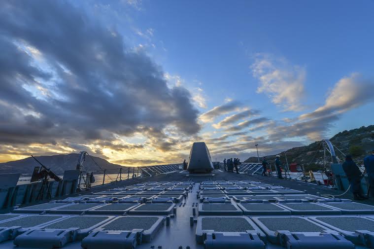 Το καταδρομικό κατευθυνόμενων πυραύλων Monterey – στην άλλη φωτογραφία πάλι στην Σούδα κατά την ίδια επίσκεψη- έχει αναπτυχθεί για την υποστήριξη επιχειρήσεων θαλάσσιας ασφάλειας στην περιοχή ευθύνης του αμερικανικού 6ου Στόλου στην Μεσόγειο.