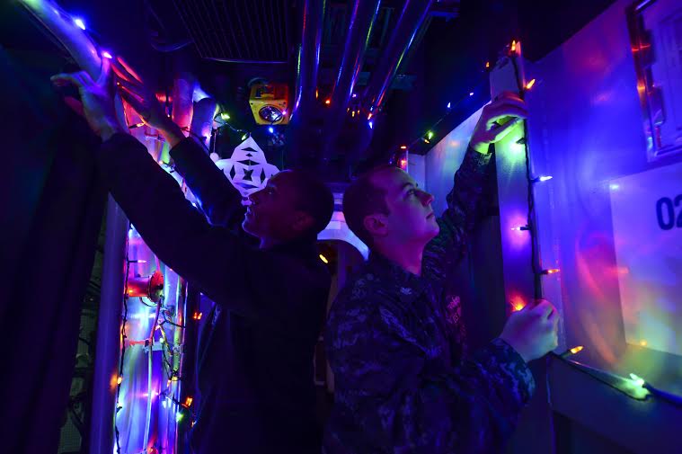 Ποιος είπε ότι στα πολεμικά πλοία δεν στολίζουν δένδρο και δεν βάζουν χριστουγεννιάτικα λαμπάκια; Στα ελληνικά μας λένε ότι συνηθίζεται - εδώ όμως σας έχουμε φωτογραφία που δείχνει ότι το έθιμο τηρείται και στα αμερικανικά πολεμικά πλοία που βρίσκονται σε περιπολίες και αποστολές μακριά από την βάση τους. Οι υπαξιωματικοί Alexander Ames, δεξιά, και Kevin Logan κρεμάνε χριστουγεννιάτικα στολίδια και φωτάκια σε »καρέ» στο καταδρομικό USS Monterey (CG 61), όσο αυτό βρισκόταν πριν μερικές ημέρες στην βάση της Σούδας, στην Κρήτη!.