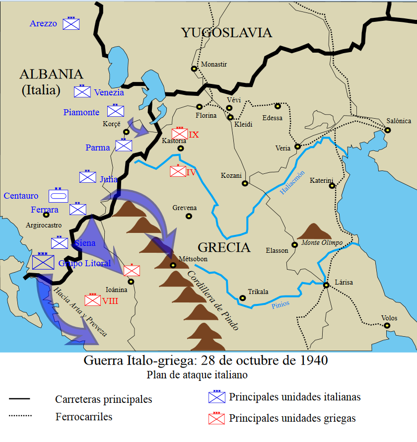 Τα ξημερώματα της 28ης Οκτωβρίου 1940 οι Ιταλοί παραβιάζουν τα ελληνικά σύνορα. Οι πρώτες πληροφορίες από το μέτωπο μιλούν για ταχύτατη προέλαση των ιταλικών στρατευμάτων (χωρίς μάλιστα αεροπορική στήριξη) και προκαλούν μεγάλο ενθουσιασμό στην Ιταλία. Οι Ιταλοί επιτελάρχες ερμήνευσαν μάλλον λάθος την «βάση σχεδίου» σύμπτυξη των ελληνικών προκαλυπτικών τμημάτων την πρώτη μέρα. Νόμισαν ότι οι ελληνικές δυνάμεις υποχωρούν. Ο Υπουργός Εξωτερικών Τσιάνο γράφει στο ημερολόγιό του στις 28 Οκτωβρίου ότι «παρά την κακοκαιρία τα στρατεύματά μας προελαύνουν γρήγορα μολονότι δεν υποστηρίζονται από την αεροπορία… Ο Ντούτσε είναι ευδιάθετος», ενώ την επομένη γράφει ότι «ουδείς κινείται να βοηθήσει τους Έλληνες. Τώρα είναι απλώς θέμα ταχύτητας».