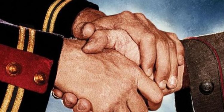 Στιγμιότυπο από την κινηματογραφική ταινία «Καλά Χριστούγεννα» του σκηνοθέτη Κριστιάν Καριόν, που προβλήθηκε στην Ελλάδα το 2005. Η ταινία έδειξε γλαφυρά πως οι άνθρωποι μπορούν να συμφιλιωθούν ακόμα κι όταν πολεμούν σε αντίπαλους στρατούς. Ηταν μια παράτολμη, σχεδόν απίστευτη μαζική εκδήλωση, που αιφνιδίασε τις στρατιωτικές διοικήσεις των εμπολέμων. Ξεκίνησε αυθόρμητα από ένα σημείο των γαλλοελβετικών συνόρων και απλώθηκε σε ολόκληρη τη γραμμή του μετώπου, μέχρι τις ακτές της Φλάνδρας.