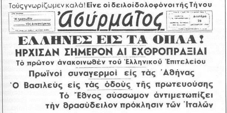 Το πρωτοσέλιδο της εφημερίδας «ΕΛΛΗΝΙΚΟ ΜΕΛΛΟΝ» στις 28 Οκτωβρίου 1940