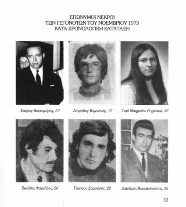 Ο κατάλογος αυτός, που έχει συνταχθεί με μέριμνα κυρίως της Προοδευτικής Ένωσης Μητέρων Ελλάδας (Π.Ε.Μ.Ε.), περιλαμβάνει 88 ονόματα, που δεν αναφέρονται πλέον αποκλειστικά στην περίοδο του Νοεμβρίου 1973, αλλά σε όλο το χρονικό διάστημα της δικτατορίας 1967-1974. Ανάμεσα τους ξεχωρίζουν όλες οι γνωστές περιπτώσεις των θυμάτων της χούντας, από τα θύματα του πραξικοπήματος και τους λιγότερο ή περισσότερο ανεξιχνίαστους θανάτους επωνύμων αντιπάλων του καθεστώτος, μέχρι τους αγωνιστές που έχασαν τη ζωή τους προβαίνοντας σε πράξεις αντίστασης και, φυσικά, τους νεκρούς του Πολυτεχνείου. Σ’ αυτούς τους τελευταίους θα επικεντρώσουμε το ενδιαφέρον μας.