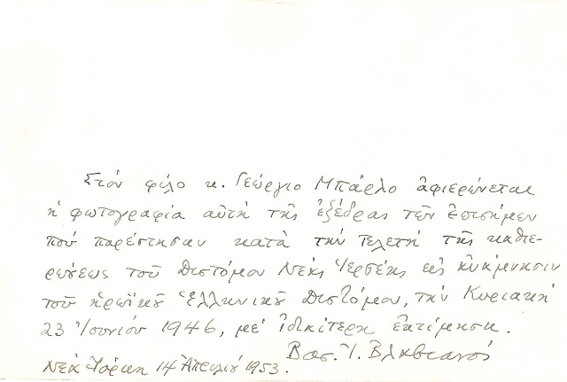 Μια φωτογραφία με χειρόγραφη αφιέρωση στον (συμπατριώτη μας) Γ.Μπάρλο, που στάλθηκε από φίλο του από την Νέα Υόρκη στις 14 Απριλίου 1953.