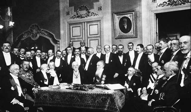 Μοναδική φωτογραφία με τον Ελευθέριο Βενιζέλο, τους ηγέτες και τις αντιπροσωπείες των βαλκανικών κρατών κατά την υπογραφή της Συνθήκης του Βουκουρεστίου, 1913, Εθνικό Ίδρυμα Ερευνών & Μελετών «Ελευθέριος Κ. Βενιζέλος».