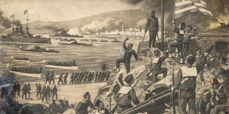 Ο ελληνικός στόλος με ναύαρχο τον γενναίο Υδραίο Παύλο Κουντουριώτη αναλαμβάνει την απελευθέρωση των νησιών. Πρώτα απελευθέρωσε τη Λήμνο, στη συνέχεια τη Θάσο, την Ίμβρο , την Σαμοθράκη, τα Ψαρά και στις 8 Νοεμβρίου τη Λέσβο. Την 11η Νοεμβρίου του 1912 ο ελληνικός στόλος(3 καταδρομικά «Μακεδονία», «Εσπερία», «Αρκαδία», δύο αντιτορπιλικά «Νέα Γενεά», «Κεραυνός» και 3 μεταγωγικά «Πατρίς», «Σαπφώ», «Εριέττα» με 2500 στρατιώτες) φτάνει έξω από το λιμάνι της Χίου. Οι Χιώτες υποδέχονται το στρατό χαρούμενοι και σίγουροι ότι αυτή την φορά θα καταφέρουν να αποτινάξουν τον Τουρκικό ζυγό.