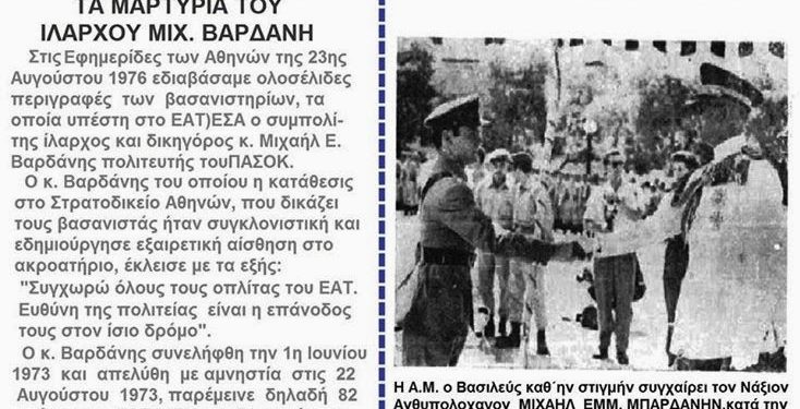 Ενα σημείο από όσα περιγράφει η κ. Νάντια Βαλαβάνη στο άρθρο της, είναι πώς ο Μιχάλης Βαρδάνης,ενόψει του Κινήματος του τότε βασιλιά,το 1967, είχε οπλίσει τα άρματα της 1ης ύλη αρμάτων που διοικούσε με πραγματικά πυρομαχικά, πράγμα που απαγορευόταν αυστηρά. Μετά από «κάρφωμα» μέσα απ’ το στρατόπεδο, αξιωματικοί του 2ου Γραφείου της Μεραρχίας διενήργησαν αιφνιδιαστικό έλεγχο στις 25.10.1967 και βρήκαν «αρματωμένα» τα τανκς.Την επομένη αποστρατεύτηκε ως «επικίνδυνος» για τις Ένοπλες Δυνάμεις λόγω εμπλοκής με τον «Ασπίδα».Δεν ήταν η μόνη του αντιστασιακή πράξη, φυσικά:Συμμετείχε στον κεντρικό πυρήνα όλων των παράνομων αντιδικτατορικών οργανώσεων αξιωματικών και σε όλες τις προσπάθειες για «κινήματα» στις Ένοπλες Δυνάμεις.Συνελήφθη και βασανίστηκε. Στη δίκη των βασανιστών του ΕΑΤ/ΕΣΑ ο Μ. Βαρδάνης απαντώντας σε ερώτηση στρατοδίκη δήλωσε ότι «δεν ήρθα με κέφι να καταθέσω».Με μεγαλείο πρόσθεσε ότι δεν αισθάνεται μίσος για τους βασανιστές του, αλλά μόνο «βαθιά μελαγχολία», για το πώς κατάφερναν να βασανίζουν ανθρώπους, ανάμεσα τους «κι αυτούς που φορούσαν την ίδια στολή».