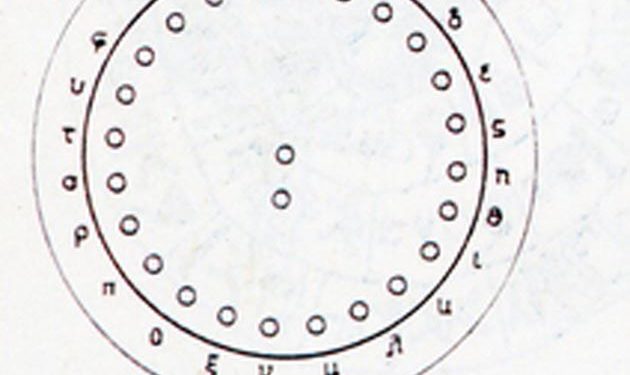 Επίσης, επί νοητής διαμέτρου με άκρο μία από τις περιφερειακές οπές, υπήρχε μια ενδιάμεση σε απόσταση 2 περίπου εκατοστών από το κέντρο. Η οπή αυτή καθόριζε και τη θέση του πρώτου γράμματος του αλφαβήτου «Α», ενώ τα υπόλοιπα θεωρείται ότι αντιστοιχούσαν σειριακά στις υπόλοιπες 23 (Ο δακτύλιος με τα γράμματα που παρατίθεται, δεν ανταποκρίνεται στην πραγματικότητα αλλά παρατίθεται για λόγους κατανόησης του συστήματος).