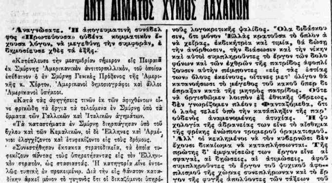 Στο πρωτοσέλιδο η εφημερίδα περιγράφει τα φρικαλέα επεισόδια που υπέστησαν οι Ελληνες απο τους Κεμαλιστές (όπως τους αποκαλεί η εφημερίδα) «… οι δε Ελληνες και Αρμένιοι ελογχίζοντο και ετυφεκίζοντο εις τους δρόμους.» Περιγράφει οτι έγιναν έκτακτα στρατοδικεία στα οποία καταδικάζονταν μόνο Ελληνες ή μόνο όσοι υπηρετούσαν στον ελληνικό στρατό. «Δια την είς θάνατον καταδίκη αρκεί μόνον το γεγονός οτι οι δικαζόμενοι υπηρέτησαν είς τον Ελληνικόν στρατόν.